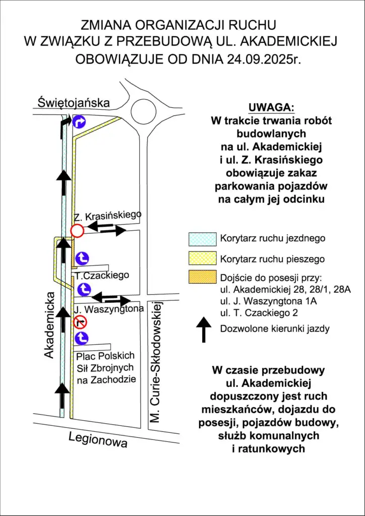 - ul. Z. Krasińskiego na odcinku od ul. Akademickiej do ul. M. Curie-Skłodowskiej będzie obowiązywał ruch dwukierunkowy, lecz bez możliwości parkowania.
